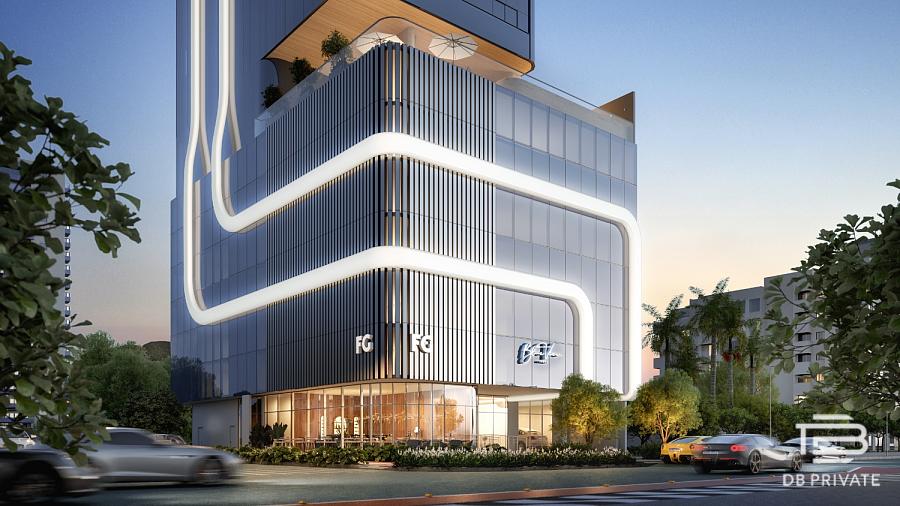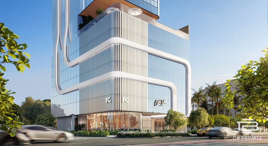 A torre conta com uma fachada de vidro curvo, que reflete o céu e o mar, integrando o edifício ao cenário natural com ares de exclusividade e modernidade.