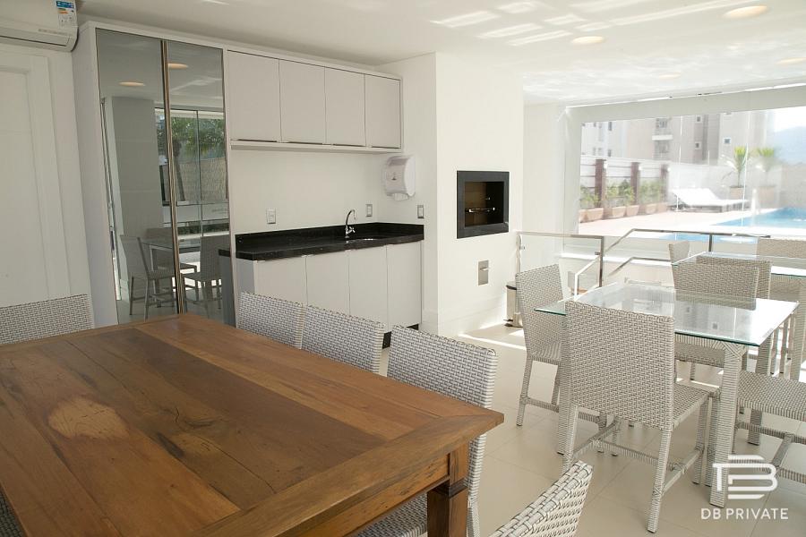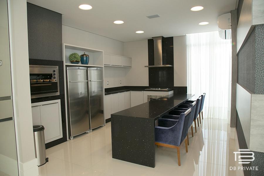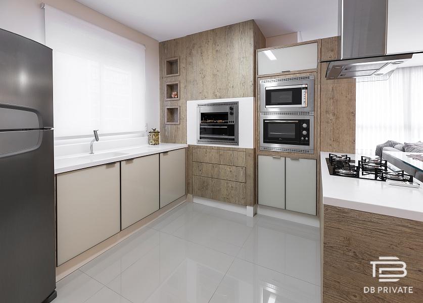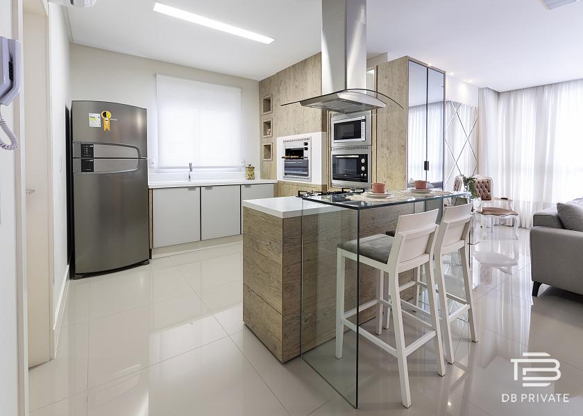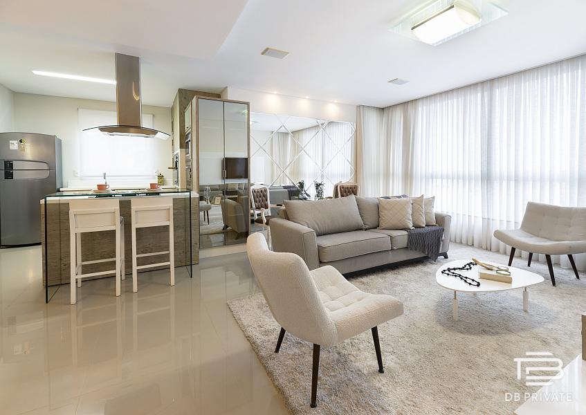 * Living integrado com cozinha gourmet, acabamento em porcelanato 80×80 e portas laqueadas