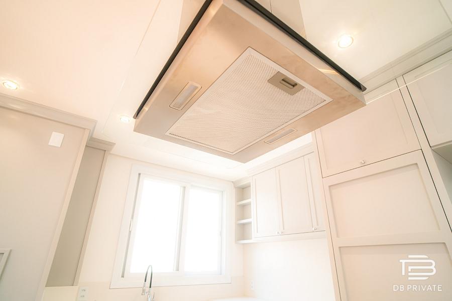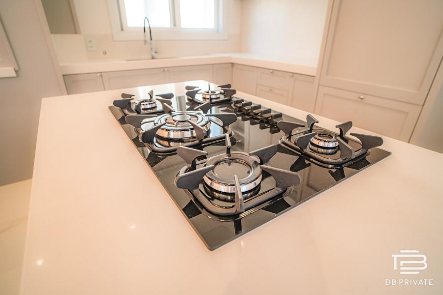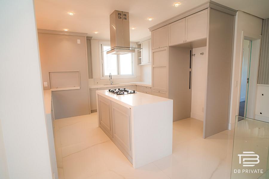 • Cozinha ampla com ilha central, conceito aberto e churrasqueira